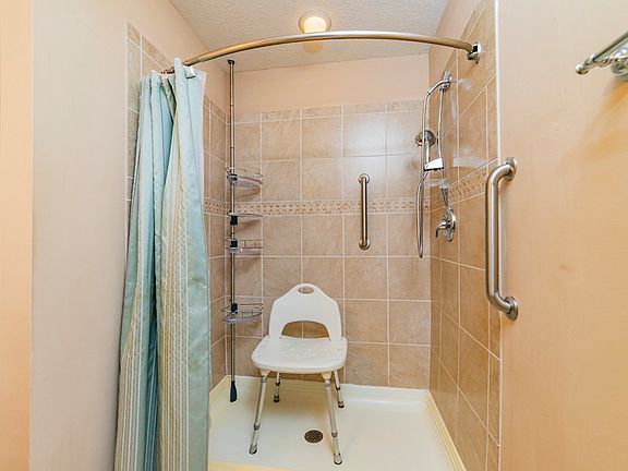 Private Master Suite: Separate from secondary bedrooms, featuring a large tiled walk-in shower and tiled floor for added comfort.