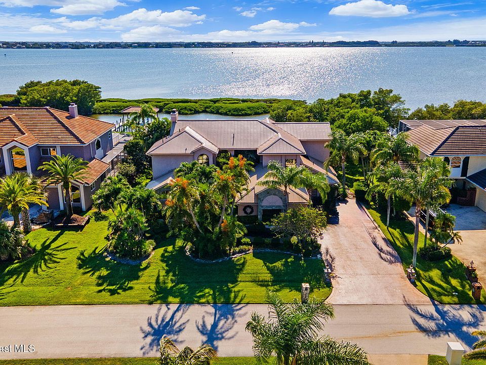 Experience coastal luxury in the exclusive gated community of Tortoise Island. This stunning waterfront estate sits directly on the Banana River with a private dock and heated saltwater pool—perfect for enjoying Florida's sun-soaked lifestyle. With over 4,900 sq ft of living space, this home features a gourmet kitchen, two fireplaces, a spacious open floor plan, and a downstairs en-suite. Elegant details include travertine floors, tray ceilings, and crown molding. Recent upgrades include a new metal roof (2023), hot water heater (2023), garage door (2022), 2 downstairs HVAC (2023), and upstairs HVAC (2024). Enjoy serene river views from the large, covered patio, ideal for entertaining. Just minutes from the beach, this home is coastal living at its finest. Community amenities include a pool, tennis courts, fitness center, boat dock and slip, and playground. A rare riverfront gem in one of the area's most prestigious neighborhoods.