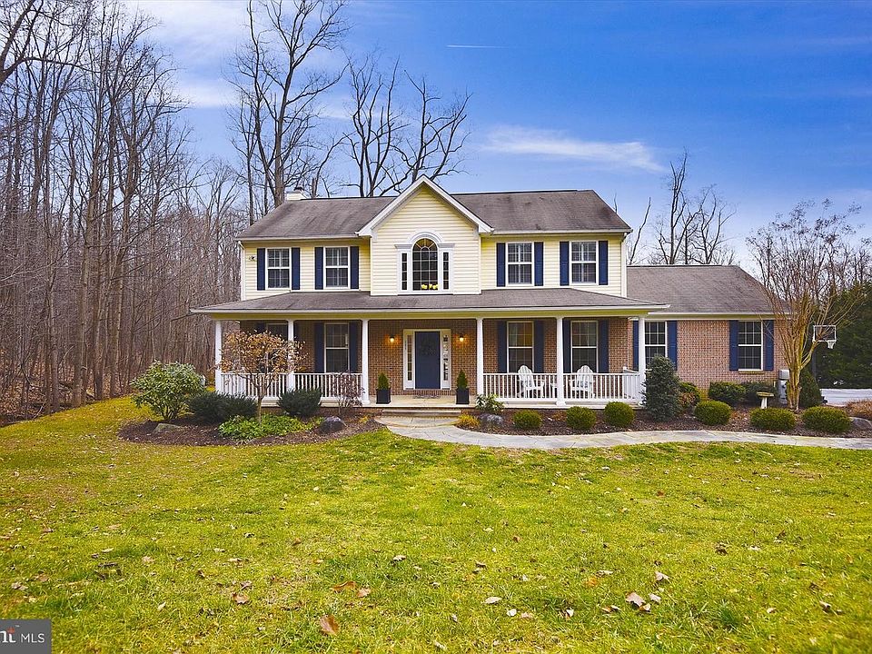 Welcome home to this classic porch-front colonial located in sought after Woodcrest. Notable updates include main and lower level fresh paint and carpet (6/18), master suite and kitchen renovation in 7/13, front walkway, landscaping and play yard (2011) along with many others in the last several years. Hardwood flooring on the majority of the main level, stairs, upper level hall and master. The kitchen features granite counters, a center island, stylish pendant lighting, under cabinet lighting, large pantry, stainless appliances including a 5 burner stove with a griddle feature. Just off the kitchen is a laundry room with a high efficiency steam washer and dryer. The family room features a wood burning fireplace and is located just off the kitchen. The master suite features hardwood flooring, a walk in closet and plantation shutters. French doors lead to a gorgeous master bath with a soaking tub, plantation shutters, separate shower with bench seating, granite topped double vanity and a water closet. Junior bedrooms and closets are generously sized. The lower level recreation room is spacious and features a wet bar, bonus room, full bath, storage and a walk out to the rear paver patio. From the covered front porch, rear deck (w/vinyl railing) or the paver patio, you will enjoy the end of street (no thru street) location. 1 Year HMS Warranty included. There is so much to love about this well cared for home, make it yours today!