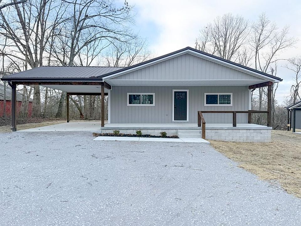 Modern styleNearly half-acre lotTwo-car carportMetal roofDurable vinyl sidingCute covered front porchStainless-steel appliances