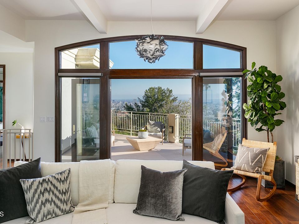 Located within the quiet, tony, Los Feliz Hills overlooking the Los Angeles basin, the architecture of Glencairn Road and its neighboring streets are tangible representations of what has made this neighborhood special for more than a century. Within a short radius, visitors to the area will find nearly every style of architecture from Craftsman to Postmodern. Here, interior design elements have been introduced which include Neoclassicism, Mid Century Modern, and Hollywood Regency. While these styles are typically found independent of each other, here they work well together by applying subtle applications of each style throughout the house. The residence, on a cul-de-sac, is walled and gated providing extra privacy, which is a bonus in this celebrity enclave. Expansive city views out to Palos Verdes are visible from nearly every room in the house plus the many balconies and outdoor seating areas enhance an already perfect location for entertaining, working from home, or even a pied-a-terre. The high ceilings and custom tile floors of the grand foyer create a sense of wonder for guests upon their arrival. And, as a bonus, guests can stop at the hidden, original wet bar before heading into the more formal spaces such as the living room, den, or formal dining room. The living room with its beamed ceilings, a fireplace, and large windows, provide incredible views of Los Angeles while a formal dining room is accessed by tall, mullioned, wooden French doors and has equally impressive views and balcony access. The remodeled kitchen is outfitted with high-end appliances, including two dishwashers, stainless refrigerator, 48' gas stove and wine cooler. On the main floor find two, en suite bedrooms as well as a guest bathroom. A bedroom with bath, balcony, and separate private entrance are on the lower level. Solar panels provide ample power to the house with a level 2 electric car charger in the two-car garage. Additionally, windows are tinted to provide added heat resistance and privacy. There is additional parking for four cars on the flat driveway. The heated pool and spa are located behind the privacy walls and are not visible from the street. 3 bedrooms, 3.5 bathrooms.
