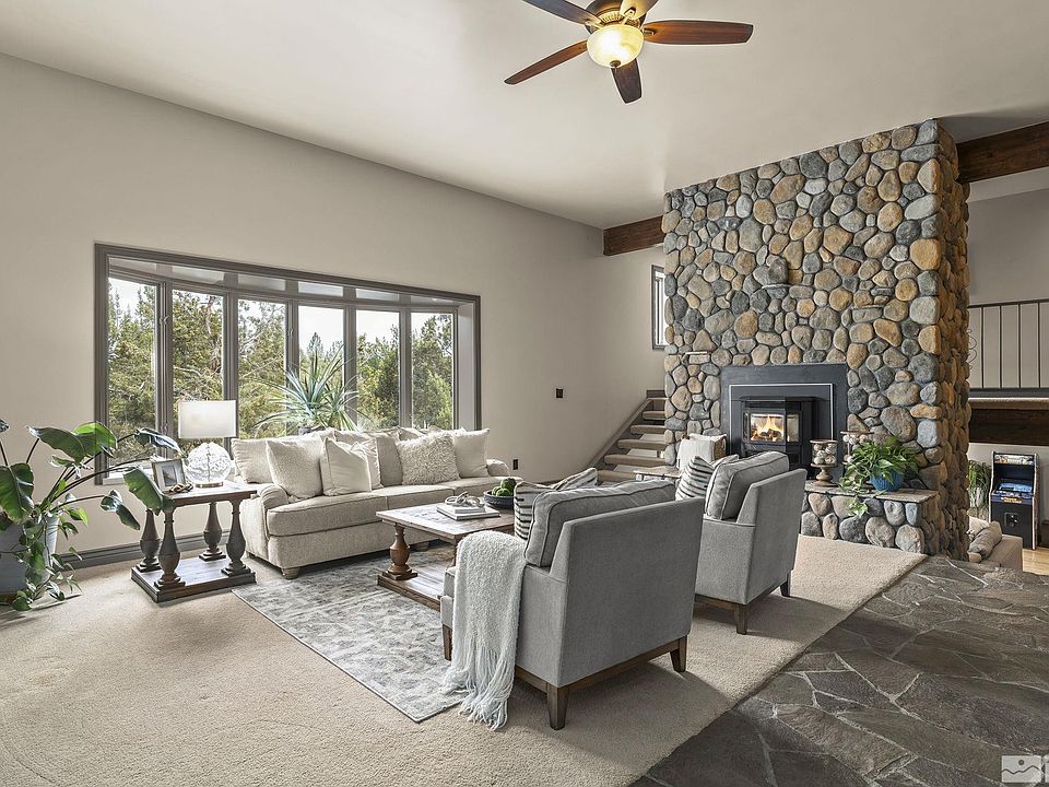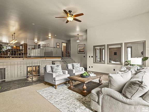 Discover a truly one-of-a-kind mountain-style retreat on 1.56 acres in west Reno’s coveted "No HOA" corridor between Caughlin Ranch and Juniper Ridge. This extraordinary property not only offers a stunning interior but also has a rare location with ownership including the steamboat ditch trail, providing privacy and direct backyard access to the Caughlin trail system and open space beyond., Inside, the home’s open-concept split-level design is rich with architectural interest, featuring floating staircases, solid peg-and-plank hardwood flooring, and expansive living spaces. Two grand rock fireplaces anchor the separate living and family rooms, while the layout includes four spacious bedrooms, 3.5 bathrooms, a dedicated office, and two laundry rooms for ultimate convenience. Entertaining is effortless with a custom-designed walk-in wine cellar and a restaurant-sized wet bar—ideal for hosting unforgettable gatherings. And for those who value sustainability, the home is equipped with an eco-friendly heat pump Xen Wall solarium HVAC system, ensuring year-round comfort with energy efficiency. For car enthusiasts and hobbyists, the property also has garage space for six vehicles, including a 1098sqft detached four-car/RV bay and workshop plumbed with water and gas. Zoned for horses (and chickens), this home is designed to accommodate your active yet private lifestyle, while providing 5–10-minute proximity to top rated public schools, the river, local shopping and dining, great parks, and I-80. Don’t miss this rare opportunity to own a distinctive property that blends natural beauty, luxury, and functionality in one spectacular package!