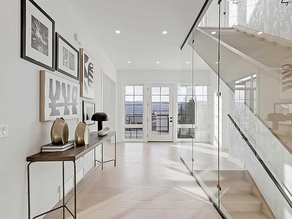 Bold architectural designSweeping west-facing viewsCustom oak staircaseGallery-style foyerWaterfall-edge stone countersHigh-end stainless steel appliancesModern gas fireplace