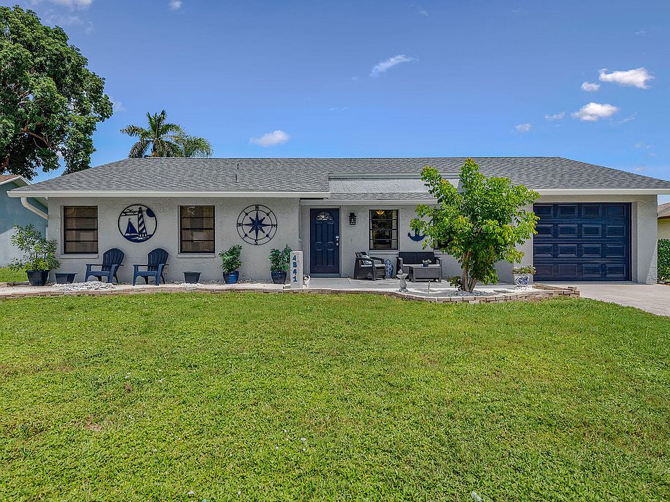 Charming and coastal-decorated, this turnkey single-family home in Shenandoah Estates offers effortless Florida living in an excellent location close to everything Naples and Marco Island have to offer. Thoughtfully updated and professionally painted inside and out, including the garage, the residence showcases a spacious, newly added Florida room for year-round enjoyment. With three bedrooms, two baths, and a one-car garage, this home blends modern upgrades with timeless charm. The interior features newer luxury vinyl plank flooring installed in 2022 with a transferable warranty, creating a light and bright atmosphere throughout every room. The living room is cozy and inviting with garden views, large windows, and a ceiling fan. The kitchen is beautifully designed with a recessed tray ceiling and lighting with fan, granite counters and backsplash, stainless steel appliances including a range with double oven, microwave, dishwasher, refrigerator/freezer, and a pantry for extra storage. A formal dining area with glass sliders opens directly to the Florida room, enhancing the flow of indoor-outdoor living. The Florida room, with its roof and roof structure replaced in 2019, is a standout feature with impact windows, tile flooring, wood-accent ceiling, and tranquil garden views. Currently used as an office, it includes a door leading to the pavered patio. Outside, unwind on the private paver patio surrounded by lush landscaping, the perfect spot for morning coffee or evening relaxation. The owner's suite offers a peaceful retreat with an Emerson ceiling fan with LED light, walk-in closet with shelving, and an en-suite bath with a shower-tub combo. Two guest bedrooms, each with modern ceiling fans and remotes, are adjacent to a bath featuring a marble vanity top and shower-tub combination. Additional updates include a freshly painted garage floor completed in 2025, professionally painted exterior and interior, and newly installed pavers along the sides of the home. The roof was replaced in 2021, and a leaf guard gutter system was added in 2023 for easy maintenance. Residents enjoy low HOA fees covering internet, cable, lawn cutting, irrigation, and pest control. Perfectly positioned just off Highway 41, this move-in ready property is an ideal year-round residence or seasonal escape with modern conveniences and coastal charm.