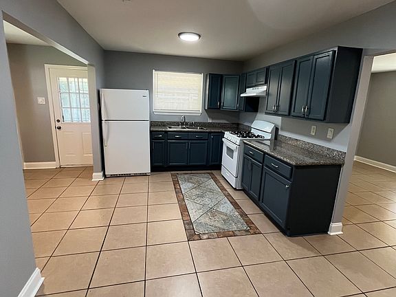 The updated kitchen offers granite countertops, a refrigerator, gas stove, washer, and dryer.