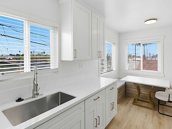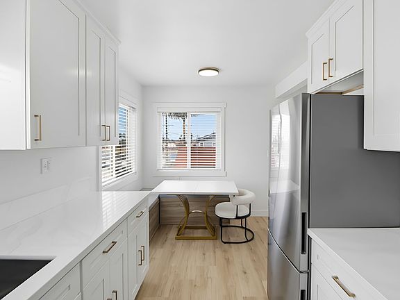 As you make your way to the kitchen you are greeted by elegant countertops complimented by high ceiling cabinetry with an abundance of storage room. The gold-colored hardware adds a clean streamline look. The sink is a deep farmhouse style with a convenient faucet sprayer. All new stainless-steel appliances complete with gas range, refrigerator, and built-in microwave. The spacious dining area is surrounded by two windows, one facing west.