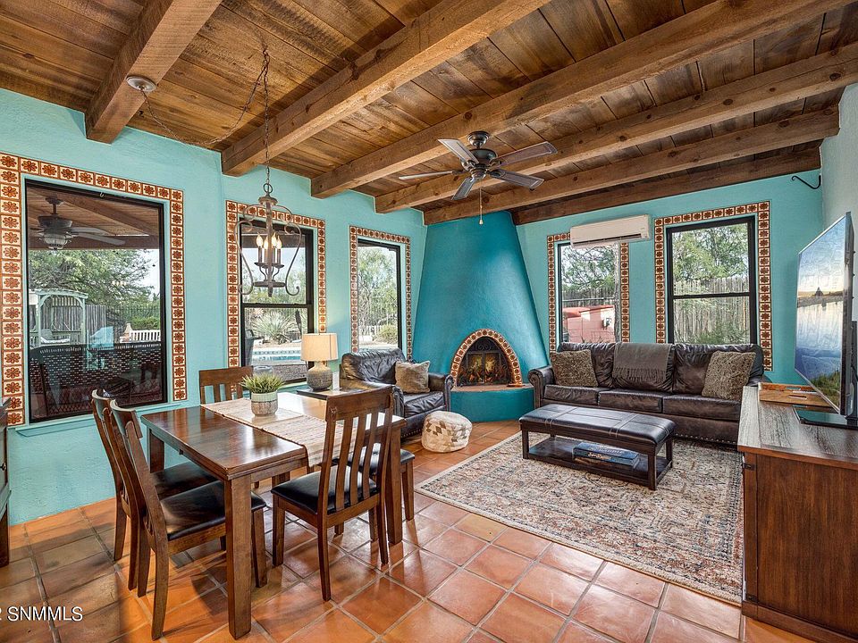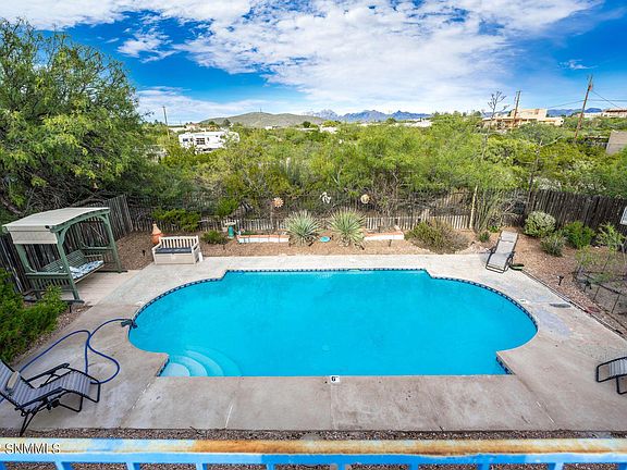 A slice of ''Old Mesilla'' in Las Alturas....conveniently located close to NMSU, highway access, shopping, and medical! Authentic Santa Fe Style home with saltillo tile flooring, wood and metal beaded cabinetry, cozy wood ceilings, a wood burning fireplace, tile-accented window frames,12 solar panels, tankless water heater, stainless steel appliances and more! Backyard oasis has a covered patio, refreshing pool, mature landscape, decorative stepping stones and flower beds! Beautiful, tall iron-fenced yards. 3 bedrooms and 2 bathrooms plus a garage....Truly a unique find for this area !