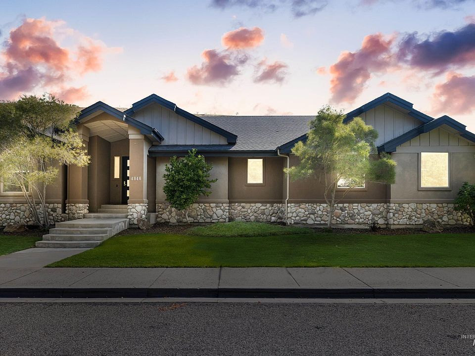 Elegant single-level home quietly set at the base of North Boise’s foothills in desirable Eyrie Canyon. An uncommon opportunity, at just the right size, this home delivers comfort and style with trails, golf, and open space just steps away. A bright great room with vaulted ceilings and an updated fireplace anchors the open layout, while the kitchen offers quartz counters, wood cabinets, and stainless appliances, including new dishwasher and refrigerator. The split-bedroom plan provides privacy, with two secondary bedrooms and a versatile bonus/office. The retreat-style primary features patio access, a sitting nook, fireplace, walk-in closet, and spa-like bath. Recent updates include fresh paint, modern lighting, plush carpet, and both fireplaces redesigned with on-trend finishes, also HVAC in 2021 and water heater in 2019. The north-facing backyard offers a covered patio, natural rock accents, and terraced spaces, while a rare spacious 3-car split garage adds storage, workshop, or home gym potential.