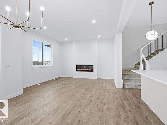 Our Rundle 24 Single-family front-attached garage home is located on Cawsey Terrace with included Front Landscaping. This home has a west facing backyard, backing onto a walk way and walking Distance from Frieda Hiller Park & K-9 School. The bright living room features a modern electric fireplace. The walk-through pantry adds everyday convenience. An enclosed side entrance offers practicality and excellent potential for future basement development. The designer kitchen showcases 3CM quartz countertops, an undermount Silgranit sink, and modern black pendant lighting above the island. Included appliances are a French-door refrigerator with internal water and ice, dishwasher, electric range, built-in microwave, and a chimney-style hood fan. Upstairs, enjoy a spacious bonus room with an open feel. The upgraded ensuite adds a touch of luxury with dual vanity sinks, and acrylic shower. **Photos are of actual home**"
