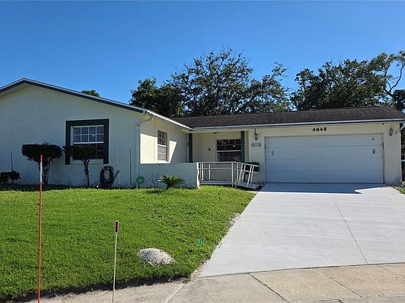 Have you ever wanted to live in a beautiful home located in a circular end of a street? Well, here's your chance! Say welcome home and hello to your next new home and yes to the address as you drive into your newly poured concrete driveway! Get ready to make a lifetime of memories in this lovely home that has been absolutely well maintained, is move-in ready, has 3 bedroom, 2 bath home with air conditioning in the garage and wi-fi operated garage door opener that uses a phone app for convenience! This welcoming home is tastefully decorated, has an updated interior, modern kitchen with breakfast bar overlooking the family room and is perfect for entertaining, as the family room overlooks the rear screened and covered lanai and huge shaded fenced-in back yard just waiting for your next barbeque or just getting away for a restful retreat. Enjoy the various fruit trees that include the hard to find Starfruit tree, cherry tree, pineapple plants, and others! It's a tropical fruit paradise! This home features LOTS of storage space and extra closets in the throughout. In addition to the air conditioning in the garage, it features tons of storage space, as well! There is also a beautiful, separate living room and dining room, all with tasteful ceramic tile flooring! The primary bedroom features an ensuite bath with walk-in shower and the secondary bathroom has also been converted to a walk-in shower, as well.
