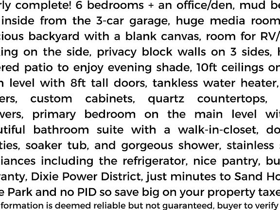 Nearly complete! 6 bedrooms + an office/den, mud bench just inside from the 3-car garage, huge media room/loft, spacious backyard with a blank canvas, room for RV/Boat parking on the side, privacy block walls on 3 sides, huge covered patio to enjoy evening shade, 10ft ceilings on the main level with 8ft tall doors, tankless water heater, rain gutters, custom cabinets, quartz countertops, tiled showers, primary bedroom on the main level with a beautiful bathroom suite with a walk-in-closet, double vanities, soaker tub, and gorgeous shower, stainless steel appliances including the refrigerator, nice pantry, builder warranty, Dixie Power District, just minutes to Sand Hollow State Park and no PID so save big on your property taxes. All information is deemed reliable but not guaranteed, buyer to verify all.