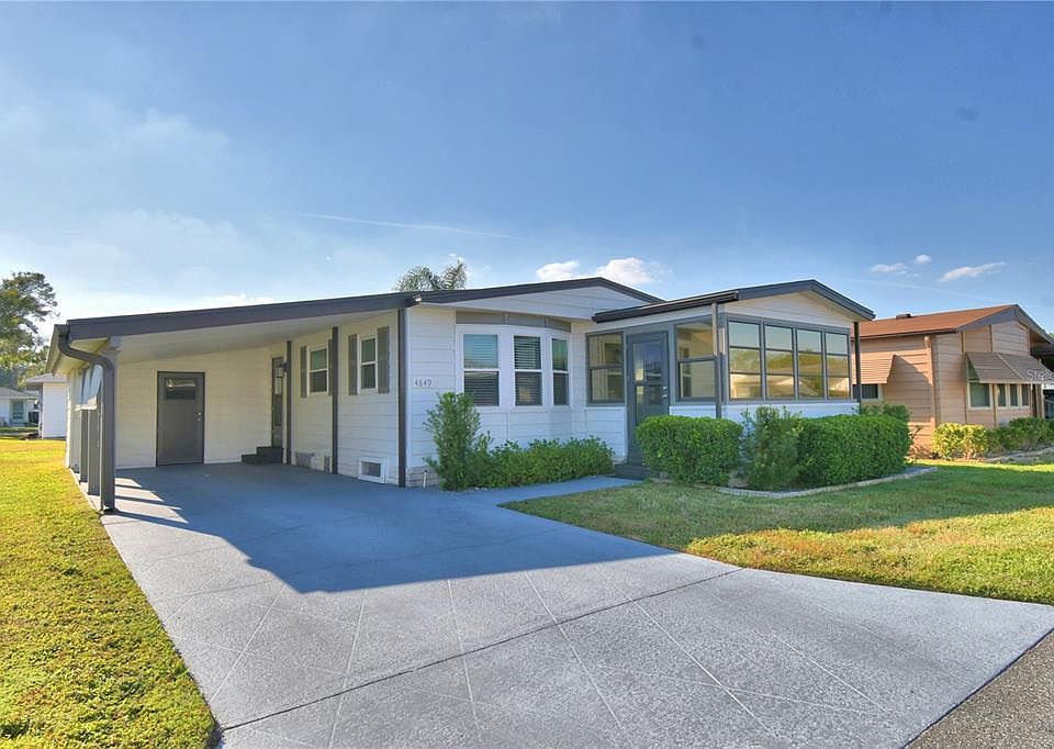Welcome to this beautifully updated 2-bedroom, 2-bath home that blends modern upgrades with comfort and functionality. This open-concept layout features a spacious living area that flows seamlessly into a bright Florida room/lanai, now equipped with a brand-new mini split system for year-round comfort. The home offers hurricane-impact and UV-protected windows, providing safety, energy efficiency, and enhanced natural light. Inside, you’ll find all-new interior paint, LVP flooring throughout, updated door hardware throughout, and brand-new exterior doors for a fresh, cohesive look and improved security. The upgraded kitchen is designed for both style and convenience, featuring a butcher block breakfast bar, added counter space, extra storage, and a new modern sink. Plumbing has been updated, along with improvements to the guest bathroom, while the master en-suite bathroom includes new shower hardware. Additional highlights include a new water heater, an upgraded easy-access layout, and a dedicated utility/laundry/storage room conveniently located off the carport with a new utility room door. The dining area is finished with new blinds for a clean, modern touch. This move-in ready home offers both charm and peace of mind with its thoughtful upgrades—perfect for comfortable Florida living. Located in a gated, active 55+ community featuring an expanded clubhouse, Olympic-size swimming pool, spa, shuffleboard courts, and many additional amenities, this home offers the perfect balance of relaxation, recreation, and low-maintenance Florida living. Don’t miss your opportunity to enjoy comfort, convenience, and resort-style living all in one place!