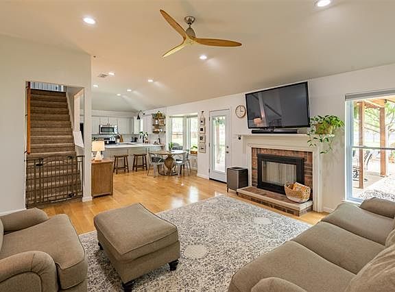 Wood burning fireplaceShade treesNicely remodeled bathroomWood flooringLarge covered patioDouble door refrigeratorFire ring