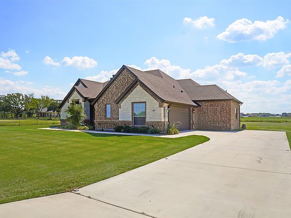 Welcome to your dream home in the heart of Paradise, Texas! Sitting on a spacious 1 acre lot, this custom brick and stone home features 2304 sq ft, 3 bedrooms, 2 full bathrooms, an office and wood burning FP. The open-concept layout includes a spacious kitchen with a large island, perfect for gathering with friends and family. Enjoy watching TV in front of the fireplace, from the privacy of your back patio. Perfect for outdoor entertaining. Located in the highly sought-after Paradise ISD, while offering the peace and quiet of country living only an hour from the metroplex. Move in ready, gutters and sprinkler system already in place.
