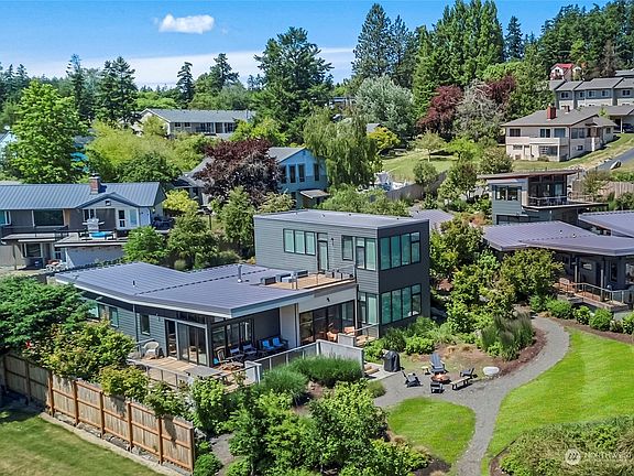 Contemporary waterfront home incredibly situated along the shores of Friday Harbor. Architecturally-designed Fish Mackay Method Home; every room enjoying views and sunlight. Open gourmet kitchen with high-end appliances, induction stovetop, Liebherr refrigerator, drawer dishwasher, & quartz countertops. A large glass fireplace offers warmth and visual charm to both living and dining areas. Stunning views of the harbor and evening light from the marvelous rooftop deck. Beautifully landscaped with native plantings. Extensive decks and cozy fire pit, perfect for entertaining and providing peaceful, private spaces. Launch paddle-boards and kayaks from the shore; just steps away from all downtown Friday Harbor amenities.
