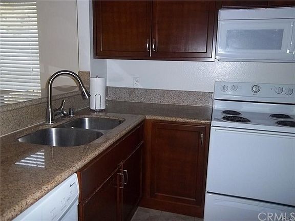 Lower level end unit with 2 bedrooms and 2 bathrooms located on either side of living room. Tile floor in living room and dining room with neutral carpet in bedrooms only. Remodeled kitchen with granite counters, built in microwave and dishwasher.. View from both bedrooms and living room. Mirrored wardrobes in both bedrooms. Inside laundry with stacked washer dryer. Large balcony off living room with large storage closet. Additional storage in carport area and just outside front door. Grassy area just outside front door. Community pool and laundry room. Each unit has one covered parking and eligible for 1 other parking pass for open area. Parking pass is approx $100 per year.
