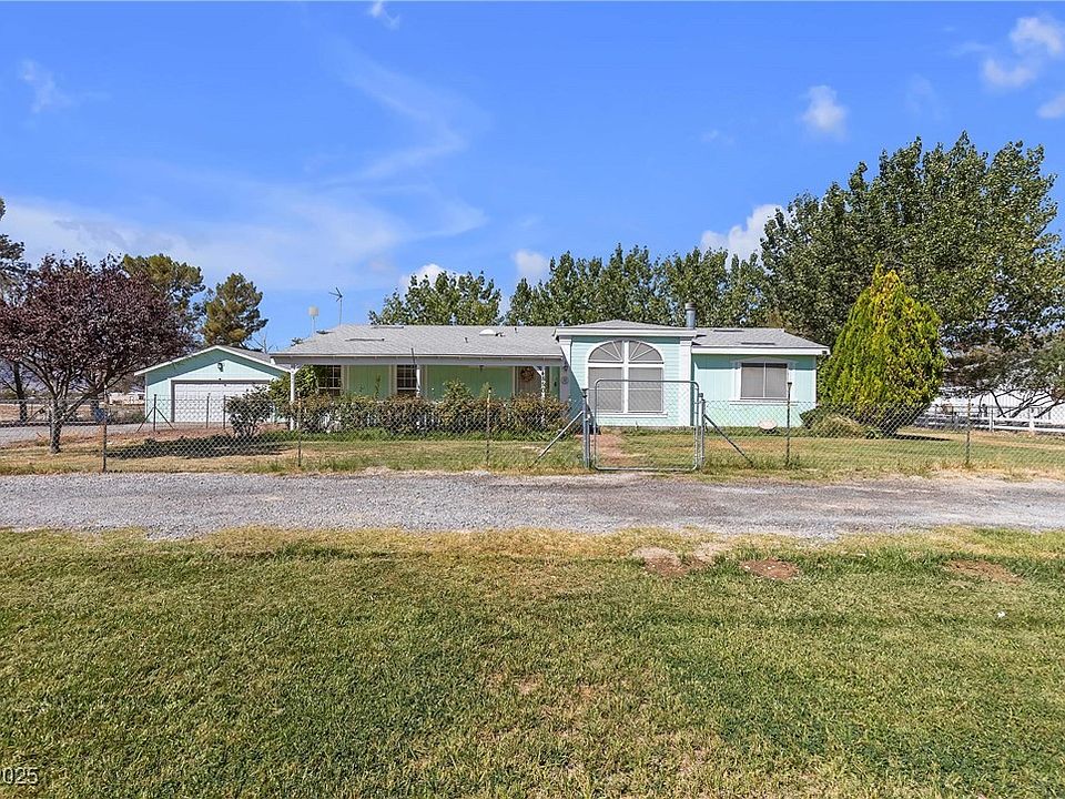 Welcome Home!! Gorgeous home in a cute neighborhood tucked away from traffic. This three (3) bedroom, two (2) bath home comes equipped with vaulted ceilings plus sunlights which provide a bright and open concept. Enter home to a large living room and an expansive kitchen with formal dining room, separate laundry room. Sit on the front porch and stare off into Mt. Charleston mountain range or transition into the backyard with a large covered patio protected by mature trees and lush grass. Sitting on one (1) acre with fully fenced backyard, RV parking, and detached two-car garage with shed included...this home has all your storage needs. Rare to find natural grass anymore, however, this home has fluffy grass in the front and backyards along with mature landscaping providing ample shade. All appliances included! Private well and septic offer near off-grid living. Come see your dream setup today!!!