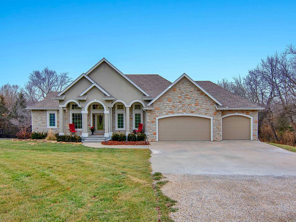 Beautiful walk out ranch on 3.5 acres in Washburn Rural. This home boast of 4 bedrooms, 4 baths, office, 2 rec rooms, theatre room, and spacious kitchen with quartz countertops. Primary suite includes fireplace, hardwood floors, large walk in closet and terrific bath! Enjoy the peaceful setting in your screened in porch or sitting on your deck that spans the entire length of the house. Extra 28 x 24 detached garage which allows for covered Parking for 5 cars.