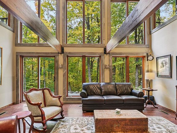 Extraordinary setting on almost 8 acres in the gorgeous Kettle Moraine welcomes you home. You'll feel like you're in a mountain retreat in the spectacular 2-story great room with a wall of windows overlooking the every changing nature scene. The open concept great room/dining room/kitchen is cozy for intimate gatherings but can accommodate a large group as well. Step into the primary bedroom and you'll feel like you're in your own private treehouse complete with private balcony & dual entrance to the large updated bath. The 2nd bedroom also has it's own private balcony. The acreage is stunning & the property is adjacent to Cedar Lakes conservancy area. This is truly a very private, one-of-a-kind home that will capture your heart!