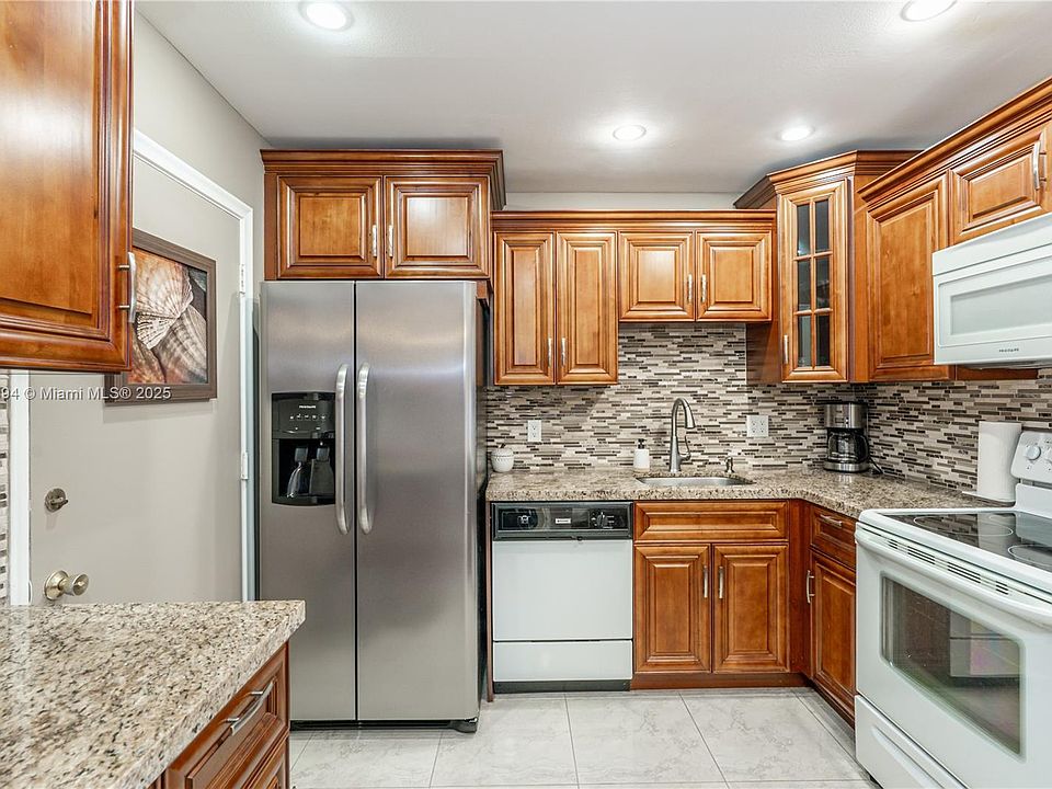 Welcome Home! This beautifully remodeled 1 bedroom 1.5 bathroom condo, featuring seamless tile flooring throughout and a bright, open-concept design is being sold fully furnished, and is truly turn-key, ready for you to enjoy from day 1. The kitchen has real wood cabinetry, granite countertops, stainless steel appliances, recessed lighting, and a sit-at counter that opens to the main living space. Meticulously maintained and gently used, this condo offers a tranquil screened-in balcony with relaxing lake views, providing the perfect space to unwind. Located in a quiet 55+ community with multiple pools, clubhouse, small fitness center, sauna, billiard room, library, and more this is a rare opportunity to own a move-in-ready, stylish retreat. Don't miss out—schedule your showing today!