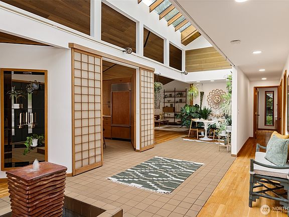 Truly one of a kind! Step into the dramatic skylight atrium & experience a home that perfectly blends iconic mid-century design w/ modern upgrades. Thoughtfully rebuilt, the owners refinished original cabinets & hardwood floors, preserved vaulted wood ceilings, and chose new fixtures to complement the MCM style—like black floor-to-ceiling windows & a chic Malm fireplace. Major system updates include electric, plumbing, furnace, foundation, windows, new exterior paint, EV charging & a long-life metal roof. Fantastic layout w/ 4 beds, 4 baths, family room, flex spaces & tons of storage. Set on nearly half an acre surrounded by trees, this exceptionally private sanctuary features sitting areas, garden beds, a greenhouse, lawn & huge Trex deck.