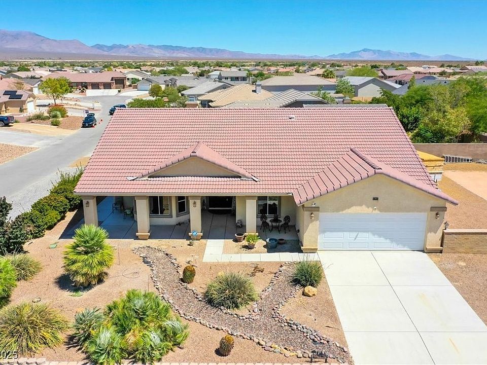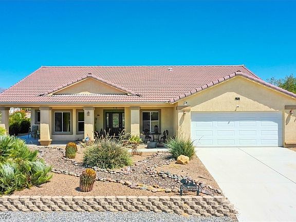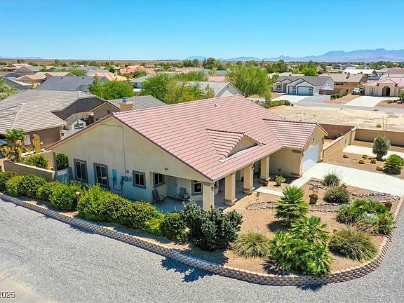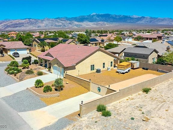 Beautiful home on corner lot in Artesia, one of Pahrump's finest communities. Flexible floorplan has large country kitchen with breakfast nook and an island. Custom cabinets feature roll-out shelves and granite counters. Off the kitchen is a space which works as a formal dining room or family room. Double doors off the foyer access a big bedroom that could also work as an office or study. The living room has a wood-burning fireplace and door to back patio. The primary suite has a huge walk-in closet, a 5 piece bath with tiled shower and an exterior door to an outdoor sauna.The suite has its own mini-split for climate control separate from the rest of the home. With a new solar system there's ample power at a low cost. Next to the home there's an RV pad with hookup and a separate gated driveway. It's just a short walk to the Artesia residents park with walking trail and a dog park. Located at the south end of Pahrump it's an easy commute to Las Vegas.Don't miss this move-in ready home.
