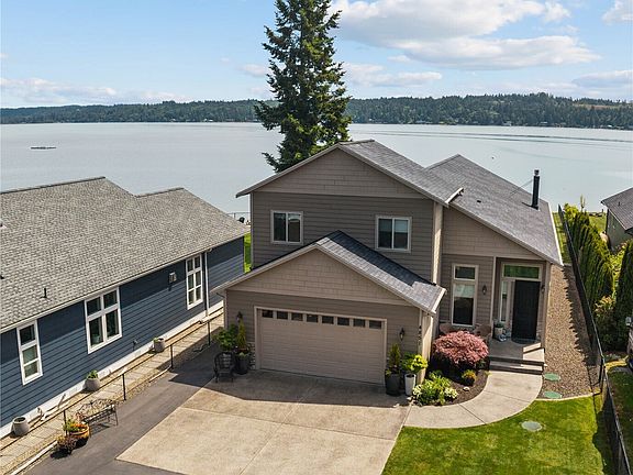 Discover this captivating 3BR, 2.5BA, 2,151 sq ft waterfront retreat on the Hood Canal serene North Shore. Boasting 60 feet of low bank waterfront, this home offers soaring ceilings, an open-concept layout, and panoramic water views from the main level. LUX upgrades throughout, including rich hardwood floors, custom millwork, and a chef’s kitchen with premium appliances. Step outside to outdoor spaces perfect for sunset dinners, fireside lounging, and soaking in the peaceful waterfront setting. A bulkhead with private shoreline, while the gated drive features 22ft RV/boat garage with 50Amp power and space for a future sports cour? Just a stone’s throw from the community boat launch, this is elevated waterfront living on the Hood Canal.