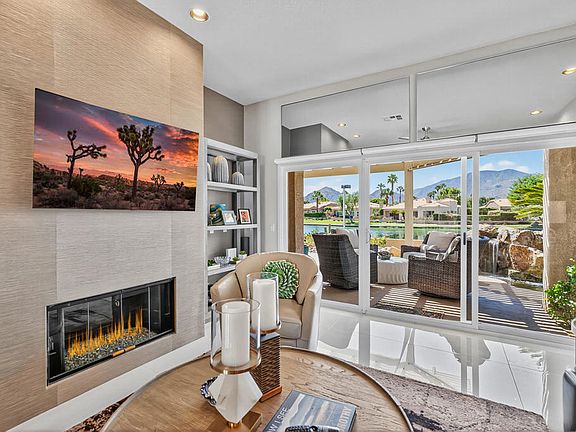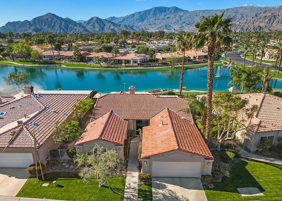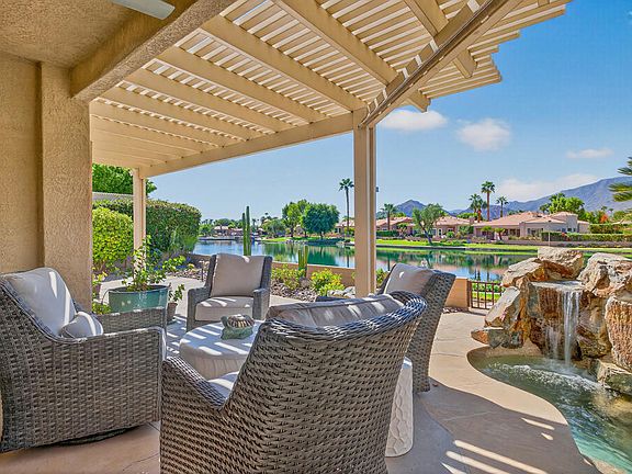 Spectacular Lake Front Property - A Rare Gem! This beautiful lake front property in Laguna De la Paz has everything you have been looking for! Featuring breath-taking lake front and mountain views this well-appointed and updated three bedroom, two bathroom home has all the amenities to help you live your dream. The open and spacious floor plan offers approximately 1,950 square feet of livable space, coupled with the best in outdoor relaxing venues. The living room includes a gas fireplace, custom built-in storage and patio access, while the dining room is a plus for formal dining and entertaining or everyday meals. The kitchen is a chef's dream with granite counter tops, upgraded appliances. Retire to the primary retreat that boasts a walk-in closet, patio access and a spectacular and luxurious en suite with both tub and seamless glass shower. Guest bedrooms are bright and offer additional living and sleeping space. The real treat is the amazing South facing outdoor space that includes a large patio area with private Spa which looks out on the lake as well as offering a stunning view of the Santa Rosa Mountains.. Laguna De La Paz offers a gated community with amenities that include a fitness center, clubhouse, lake, walking paths, tennis and pickleball courts, pools and spas and more. Fine dining, golf courses and shopping are just minutes away.