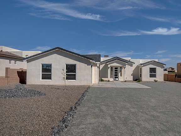 Beautiful new construction home features 2856 sq. ft., 5 bedrooms, 3 baths, 3 car garage, refrigerated air, synthetic stucco, tile and TPO roof. porcelain tile flooring in main and wet areas and carpet in bedrooms. Kitchen has solid white, maple wood cabinets, black pearl granite island, stainless steel appliances, recessed lighting and dining area. Spacious great room with 10 ft ceilings opens up to a covered patio with gas stub and electric outlet ready for your barbecue grill. Sit in your front patio and take in the beautiful views of the Sandia Mountains. Your buyers will love this home!