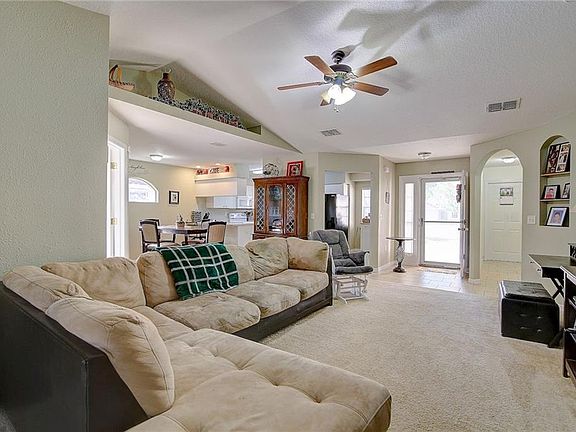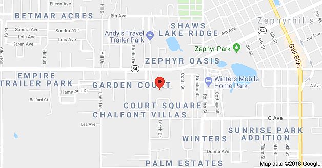 Adorable and affordable! This charming 3br/2ba/2cg home is located in the well-established Court Square neighborhood in the heart of Zephyrhills. Clean as a whistle, this one story home was built in 2000 and has been wonderfully maintained. A brand new A/C adds instant value! Showcasing 1500SF, you will appreciate the open floor plan and vaulted ceilings. The eat-in kitchen is a true blank slate and offers formica countertops, charming original cabinets, oversized 18 tile floors, a closet pantry, and breakfast bar. The master bedroom includes a walk-in closet and en suite bath with his & hers sinks and a garden tub. The two additional bedrooms are both bright, offer ample space, and share a nice hallway bath. The 3rd bedroom is located off the dining room and would be perfect as an office or den. The enclosed patio is ideal for entertaining and overlooks the fenced, private backyard. This fantastic home is in a quiet neighborhood on a cul-de-sac street that has NO HOA OR CDD FEES!