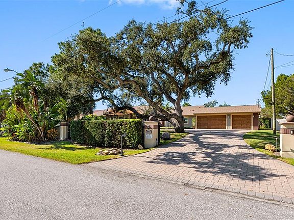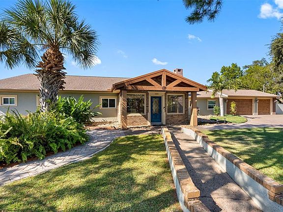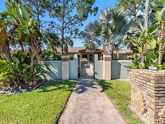 One or more photo(s) has been virtually staged. Welcome to this unique, one-of-a-kind, executive gated estate sitting on 1.25 acres of pristine landscaping. As you enter the home you are greeted by a large foyer with plenty of natural light. The oversized family room offers vaulted ceilings, updated custom tile flooring, updated lighting, dual ceiling fans and a stone accent wall. Just off the family room you will find an updated half bath. The kitchen has been fully remodeled including granite countertops and a custom tile backsplash, and stainless-steel appliances-a true chef’s dream. A large farmers sink with a window overlooks the rear pool area, and a center island with unique exposed granite edging complete with slide out convection microwave. An abundance of cabinets offers plenty of storage and space in the eat-in nook with custom flooring. A wood burning fireplace with a large hearth and propane option for added convenience completes this area. The main home has all bedrooms located on the first floor with an upstairs oversized bonus room (16x20), perfect for a play area, media room, home office or to use as an additional bedroom. The primary bedroom has an en-suite bathroom featuring dual sinks, granite countertops, a jetted tub with a tv and a large walk-in shower with multiple shower heads. The walk-in closet is a separate room with custom shelving, sitting area, windows allowing plenty of lighting with a door leading to an outdoor sitting area. Down the hall you will find several built-in closets for storage, two additional spacious bedrooms, and an updated full bathroom with a walk-in shower, all offering plenty of space with large windows. From the eat in kitchen you will find French doors leading to the oversized lanai with a custom crafted vaulted wood ceiling and a spa/hot tub. An oversized saltwater pool surrounded by pavers features a raised rock water spill. All the pool equipment was recently updated and includes a storage shed. This property is perfect for large gatherings and is an entertainer’s delight with brick and paver walkways throughout. A detached two-bedroom guest home with separate entrance is located at the rear of the property. Entering you will find a nice-sized living room, with a full kitchen including granite countertops, stainless steel appliances and plenty of cabinet space including a laundry closet & covered private patio area. Perfect for an in-law suite or out-of-town guests. In addition, there is a detached garage complete with air conditioning, a separate side entrance, a workout area and bathroom. A perfect retreat for a game of poker, workshop or hobby room. Just outside the sliding glass door sits a Basketball court. The main home is equipped with a tankless hot water heater and an additional water heater located in the attached 3-car garage for the kitchen and half bath. The garage has storage shelving, a wet sink with granite countertops and wood cabinets. The laundry area has a wood countertop, cabinets and a stone wall accent. The property also offers a fully screened detached building that is perfect for plants or a sitting area. The property is equipped with an RV pad with 50amp service and a 250-gallon propane tank with plenty of room for all your toys! You will notice a combination of paver walkways and brick that was originally from the streets of St. Pete. Most windows have been updated to “impact resistant”. The block walls are reinforced with concrete and makes the construction extremely strong. A must see Home!