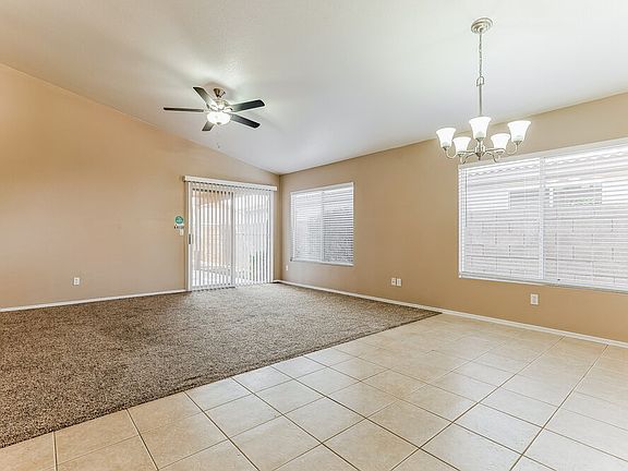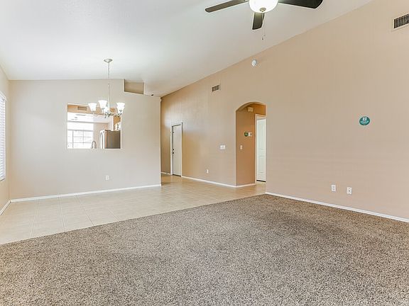 This move-in-ready rental home in Mesa, AZ has an attached garage, a covered back patio, and plenty of charms. Step inside to find a single-story layout with three bedrooms and two bathrooms within 1,548 square feet of space. The home's living room is a comfortable space with plush carpeting and a ceiling fan. The sliding glass doors leading outside bring in lots of natural light. Just a few of the features you'll love in the kitchen include upscale quartz countertops, a pantry, and a double-basin sink with a gooseneck faucet. There's even a pass-through into the dining area. Follow the double doors into the main bedroom suite, which has a white ceiling fan and an arched doorway leading into the en suite bathroom. Schedule a time to tour this property today!