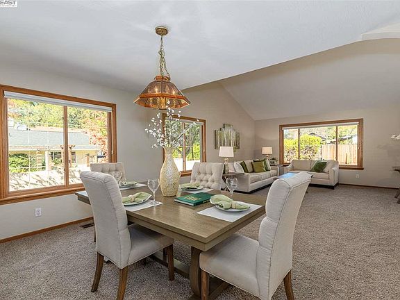 Gorgeous! Updated throughout. Very large living room and formal dining area w/ new carpet. Sunny updated kitchen with center island....overlooks tranquil back yard w/apple, plum, lemon, avcado, and persimmon trees. Large family room with stone/brick fireplace. 4th Bedroom is downstairs + half bath. Large master bedroom w/ slider to private deck. Updated Master bath and large walk in closet. Inside laundry room. Beautiful dual pane windows with etched glass. House sits off Crow Canyon Road on private driveway shared with 3 other homes.