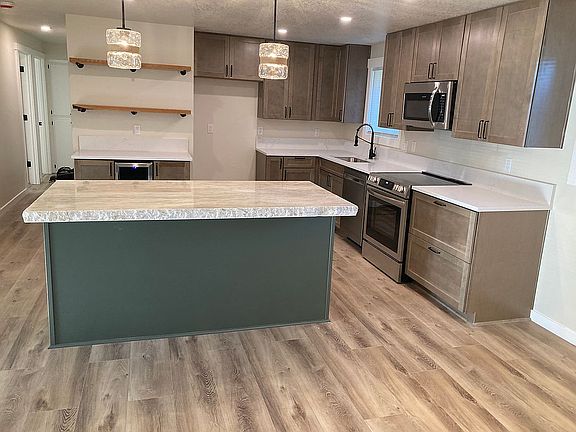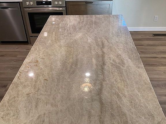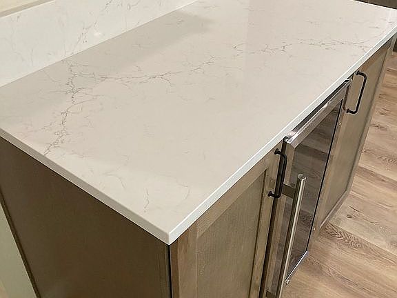 Newly updated kitchen with fresh cabinets ,under cabinet lighting, quartz countertops, large granite island, modern appliances, and refrigerator included. ?