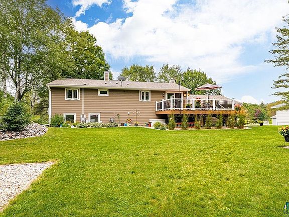 Peaceful streets, privacy and mature trees lead to this impressive home, set in an established neighborhood. Central to Hermantown's amenities, buffered from the activity. The spacious yard boasts many hardscape & landscape improvements. A maintenance free exterior, clad in LP SmartSide, Marvin Windows, steel soffit/fascia & composite decking. Enter the foyer, both levels are daylight filled, every space is bright. Generous open living & dining space, access the deck & stunning kitchen here. Quartz countertops, new cabinetry, all new appliances & a beverage cooler. The primary suite includes an updated bath. Two additional bedrooms & new bath; quartz, dual sinks & glass enclosed tub/shower complete the main level. Downstairs features a spacious family room, gas fireplace, large bedroom, a third new bath, light & bright laundry room, generous storage & cedar walk-in closet. The attached garage is insulated & heated with an epoxied floor & organized storage. Updated for today, thoughtfully completed, perfectly maintained.