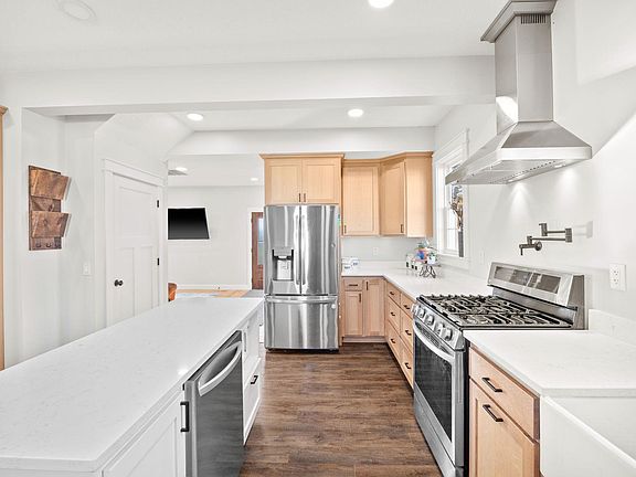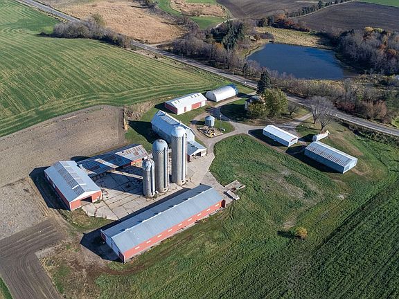 10-acre hobby farm features a beautifully renovated farmhouse and over 30,000 sq. ft. of outbuildings including 9 outbuildings, 3 silos, and a grain bin. The home was renovated down to the studs and now features a custom gourmet kitchen with 40' of quartz countertops, white oak custom cabinetry, farmhouse sink, and pot filler. Refinished hardwood floors, LVP, and new carpet throughout. Updates include plumbing, electrical, spray foam insulation, beams, walls, Pella windows, and mechanicals (furnace, AC, water heater, softener.) Flat house roof and garage roof replaced in 2025. Spacious upper-level bedrooms, including a primary ensuite with walk-in shower and closet. Converted attic loft adds extra living space. See full list of home improvements in supplements. This property has stunning views, modern home updates, an abundance of storage, tillable acreage and room for animals making it perfect for a hobby farm.