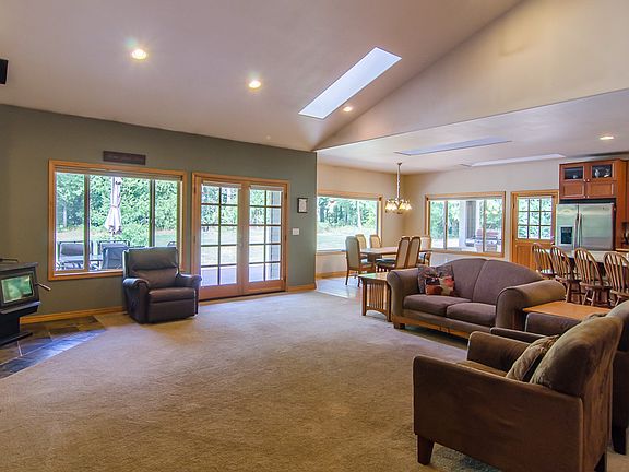 Custom 3282 sq ft home on 5 acres at the dead end of one of the most desirable roads in the county. In the midst of a sunny clearing embraced by trees, this 3 bed, 2.75 bath home is spacious. Huge vaulted great room with open floorplan that includes kitchen, dining and living rooms. Pantry, mudroom, bonus room, and laundry room. Oversized garage, generous deck, covered BBQ porch. Tasteful landscaping with stonework lined, paved circular driveway. Large shop with room for for toys, boat and RV.