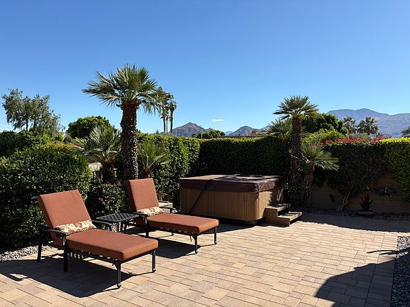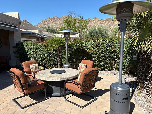 With an extensive array of high-end upgrades inside, outside & behind the scenes, this furnished home in a guard-gated community in La Quinta rivals today's finest model homes. Beautifully landscaped grounds are enhanced with pavers on the driveway, walkways & spacious backyard patio, where a gate leads to a lush greenbelt & residents-only pool and spa. Beyond a gated side entrance, the open & light single-level home reveals a modern & sophisticated interior with high ceilings, tile flooring throughout, & fresh on-trend paint. The open-concept residence shares only one wall with its neighbor & features 3 bedrooms and 2 baths in approx. 2,001 sq. ft. A great room with upgraded stacked-stone fireplace & custom built-in cabinetry opens to the backyard, allowing for easy indoor/outdoor entertaining. Scenic views enrich the dining room, & the new chef's kitchen reveals an island, nook, pantry, custom cabinetry with white & natural wood finishes, & stainless steel KitchenAid appliances. Quartz countertops shine in the kitchen & baths, & custom window treatments, a new entry door, custom crown & base molding, ceiling fans, & a large laundry room with extra storage & new LG washer and dryer set are featured. Both baths boasts new walk-in showers with custom tile surrounds, and custom vanities with two sinks and picture-frame mirrors. The primary suite embellishes luxury with a double-door entry, direct access to the backyard, and a generous walk-in closet.