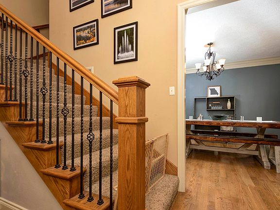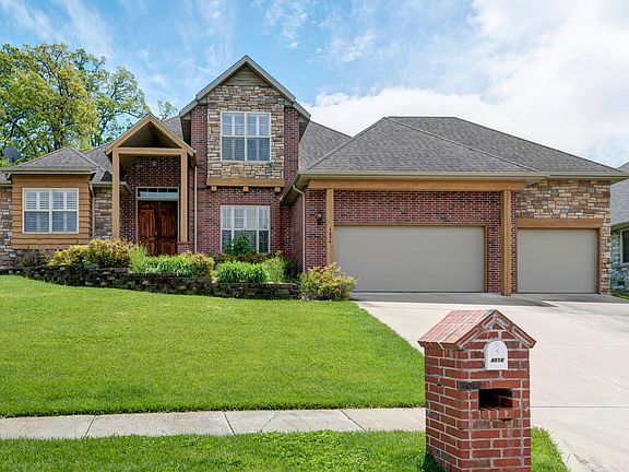 Located in the beautiful Copper Mill subdivision in east Springfield, this home provides great space for daily living or entertaining a crowd. A stone and wood-beam front elevation greets you, and as you enter the double wooden front door you find a large entry and beautiful wood flooring throughout main living areas. A formal dining room faces the front, with huge living space and kitchen divided by a stone see-through fireplace. Second dining space and island seating, lots of cabinet space, Samsung appliances. Custom window blinds throughout. Master bed/bath on main floor with jetted tub, walk-in closet, linen closet, separate water closet and walk-in shower. Second bedroom on main floor also. Two bedrooms and a full bath upstairs, one bedroom is extra large with walk-in closet. Another door opens to large attic storage space. laundry chute from upstairs to main level laundry. Screened back porch, two 40 gallon water heaters, hot water recirculating pump, water filtration system, emergency generator hook-up, zoned HVAC, security system, inground sprinklers, three-car garage and partial wood fenced back yard. Neighborhood HOA includes common area maintenance, trash service, tennis and pool. Only one mile to Hwy 65 & Sunshine intersection for shopping and dining. Sequiota/Pershing/Glendale schools.