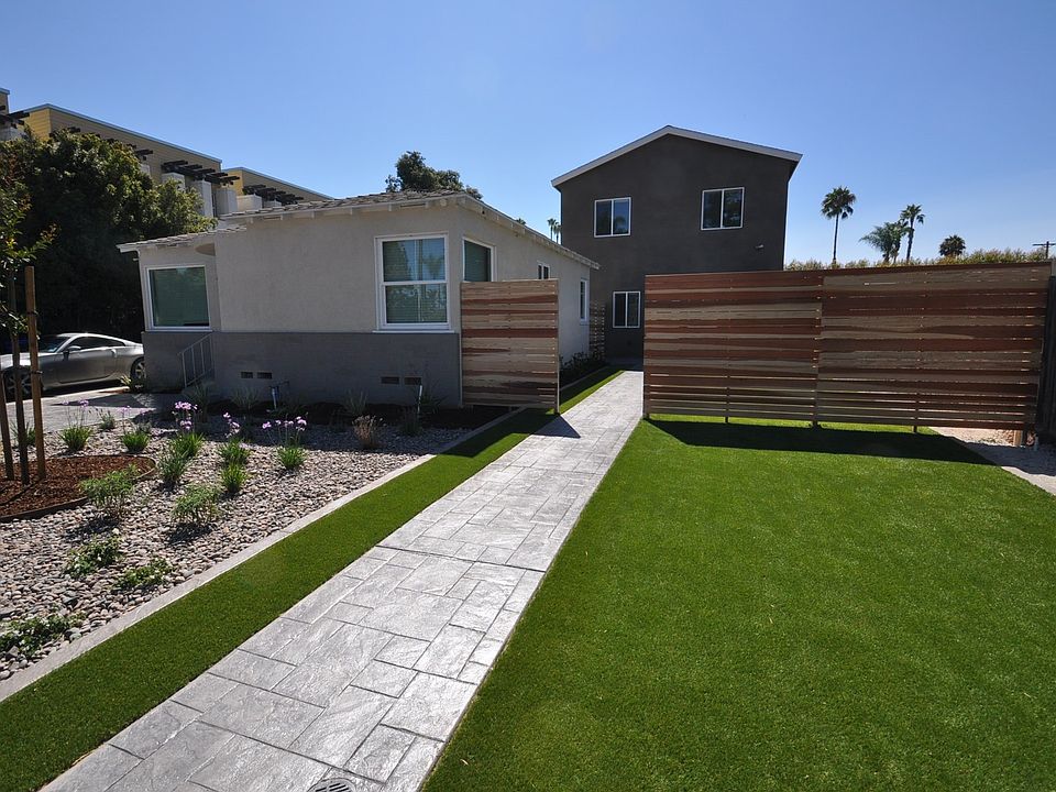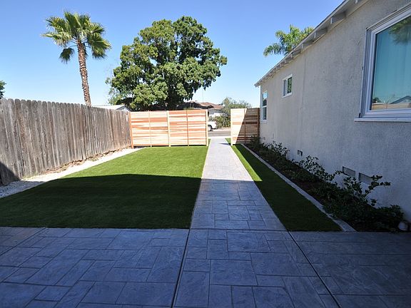 Large, gated front yard patio with turf. Private back yard with stamped concrete.