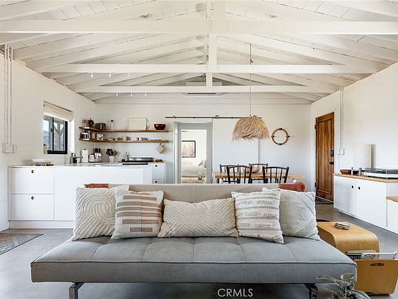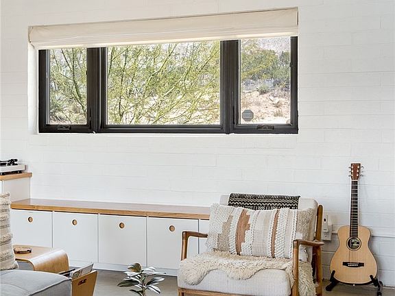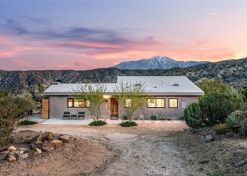 Dramatic mountain views envelop you from all directions in this artist-designed mid-century retreat spanning 5 serene acres under the majestic backdrop of Mt San Jacinto. The original 1959 brick cabin serves as an open concept living & dining area with soaring exposed beam ceilings, a cozy wood burning fireplace, built-ins, and a modern kitchen complete with quartz countertops, new copper plumbing, and a clever hidden under-counter fridge. A thoughtfully curated 2022 renovation introduces a chic new primary bedroom, oversized bathroom, bonus sleeping loft, and mini splits for climate control. The generously sized bedroom features a walk-in closet and built-in office nook, punctuated by a wall of glass sliders inviting you to take in the striking outdoor panorama. Down the hall you’ll find a hidden stackable washer & dryer and a spa-like bathroom with venetian plaster, dual sinks, a soaking tub, a shower room, and a separate water closet. A ladder opens to a secret upstairs 300 sq ft sleeping loft with more impressive views, making a delightful guest bunk or a quirky clubhouse for the kids. A 384 sq ft covered outdoor patio spans the rear of the home, leading to an open-air lounge and dining area with a gas grill, propane fire pit, and built-in hammocks to unwind under the stars. Follow the professionally landscaped path down to the most instagrammable moment of them all - a bespoke wooden bathhouse where 2 vintage clawfoot tubs beckon you to enjoy a hot soak framed by yet another incredible view. An original 1968 Silver Streak trailer sits on the side of the property, serving as a fabulous potential guest space, clubhouse, or home office. Ideally situated less than 2 hours to LA, 15 minutes to Palm Springs, 20 minutes to Joshua Tree National Park, and surrounded by 154,000 acres of publicly accessible canyons, preserves, white waters, trails, and mountain peaks of the Sand to Snow National Monument, this property is the perfect home-base for everything from romantic getaways to family adventures. Sold turnkey so you can grab your suitcase and move right in, or take over the “guest favorite” airbnb account to start generating short term rental income right away. An adjacent buildable 5 acre parcel is available to purchase separately to create your own 10-acre multi-parcel dream compound.
