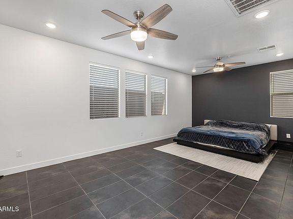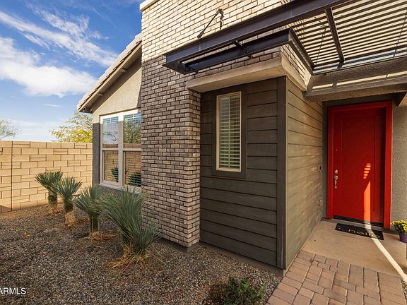 This stunning home offers beautiful curb appeal with elegant stone accents, modern paneling, and a striking red accent door. Inside, you'll be greeted by wood-plank tile flooring, neutral paint tones, and upgraded baseboards, creating a warm and inviting atmosphere. The chef's kitchen is a true standout, featuring quartz countertops, black hardware, white shaker cabinets—including staggered uppers—and a unique touch with windows beneath the cabinets that flood the space with natural light. The kitchen seamlessly opens to the spacious main living area, where a massive sliding door enhances the bright, airy feel and leads to the backyard. The oversized primary suite is a retreat of its own, complete with upgraded tile flooring, a dual vanity with extra storage, and a luxurious, oversized shower. A spacious walk-in closet adds to the suite's appeal. Step outside to enjoy a low-maintenance backyard with beautifully designed planter boxes along the side yardperfect for gardening or extra greenery. Located in the highly sought-after Eastmark community, this home offers a true resort-style lifestyle with access to luxurious pools, splash pads, multiple parks, Steadfast Farm, and the state-of-the-art clubhouse, "The Mark," which hosts year-round events and activities. Don't miss out on this exceptional opportunity!