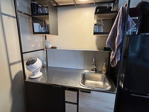 King bed, kitchenette, closet, bathroom, shower, balcony and outside storage.