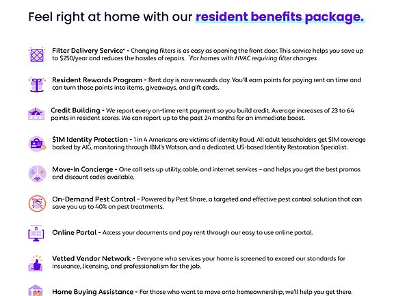 At Kairos Property Management, we strive to provide an experience that is cost-effective and convenient. That's why we provide a Resident Benefits Package (RBP) to address common headaches for our residents. Our program handles pest control, air filter changes, utility set up, credit building and more at a rate of $39.95/month, added to every property as a required program. More details upon application. In addition to RBP, we provide access to liability insurance that meets your needs.