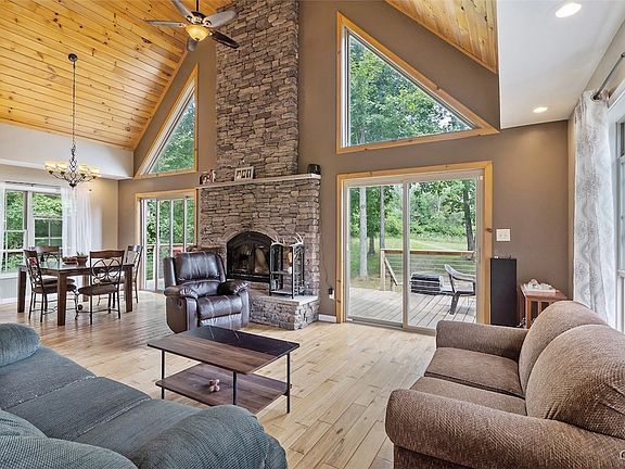 Tucked back off the road on 4.41 acres, this 2,016 sq. ft. Cape Cod offers the perfect balance of country and convenience. Step inside to an open-concept layout where the kitchen, dining, and living spaces flow seamlessly together. The kitchen has hickory cabinets, a center island with seating, and plenty of gathering space. The living room is highlighted by tongue-and-groove cathedral ceilings and a stunning stone fireplace that serves as the centerpiece of the home.