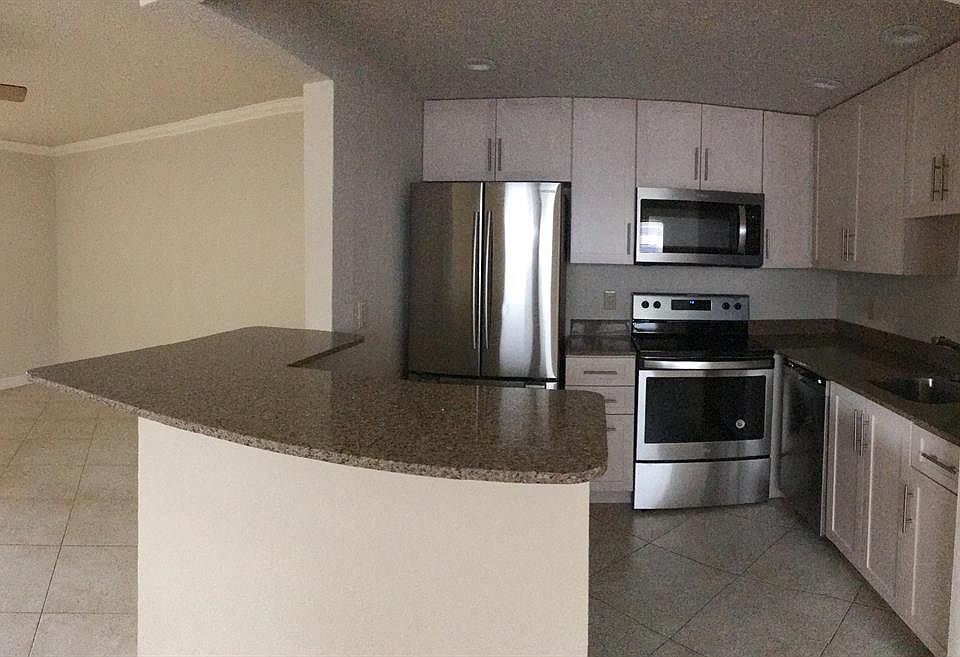 Renovated nice kitchen open to living area! Quartz counters. Washer & Dryer included. Primary bath with walk in shower. Tile throughout NO CARPETING! Premium FIRST floor unit. Park at you patio door.Newer AC and Hot water!
