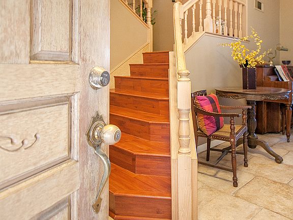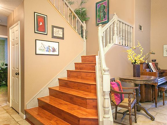 Welcome to this beautiful Wood Ranch home situated on a quiet tree lined street. This updated home features a remodeled kitchen, granite counters, newer backsplash, stainless steel appliances including an electric viking range and tile floors. Off the kitchen is a generously sized dining and living room with vaulted ceilings and stone floors. The family room offer a cozy fireplace. There is also a downstairs bedroom and full bathroom. All bathrooms have been remodeled with new flooring, vanities and showers. Upstairs there are three bedrooms with wood floors though out including a large sunlit master with an ensuite bathroom. The backyard is an entertainers delight with a 55 inch outdoor television, built in bar and artificial low maintenance grass. It is just the right spot to grill up dinner and enjoy time with family and friends. You won't want to miss out on this fabulous home!