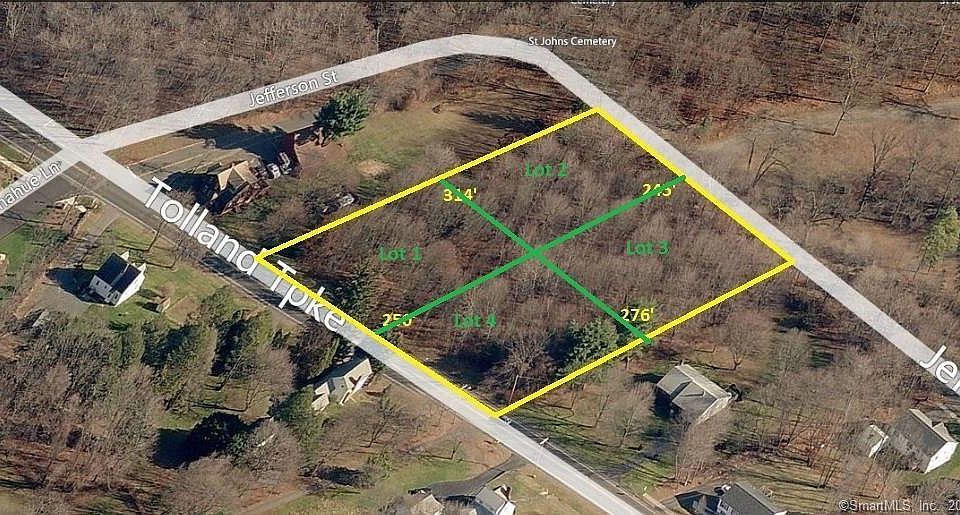 Attention Builders! Two legal Lots. Potential four lot split with frontage on Tolland Turnpike and Jefferson Street. Property is currently two legal lots, split each to make four lots, see survey image. Higher density may be possible with zone change. Seller wants offers!