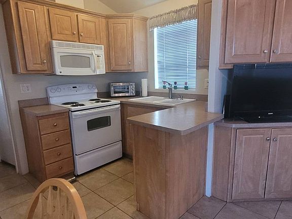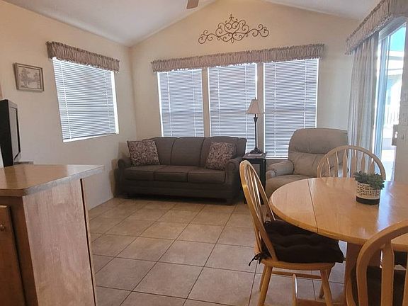 Close to Community Center! Vaulted Ceilings, Recliner, Sofa Sleeper, U-Shaped Kitchen, Vinyl Floors, Built-in Microwave, Blinds, Ceiling Fans, Bay Window, Sun Screens, Flat Screen TV, Queen Bed, Built in Drawers, Outdoor Living Area! Shed with Full Size W/D, Plenty of Storage, Central A/C & Heat, LOT RENT PAID UNTIL OCTOBER 2026!