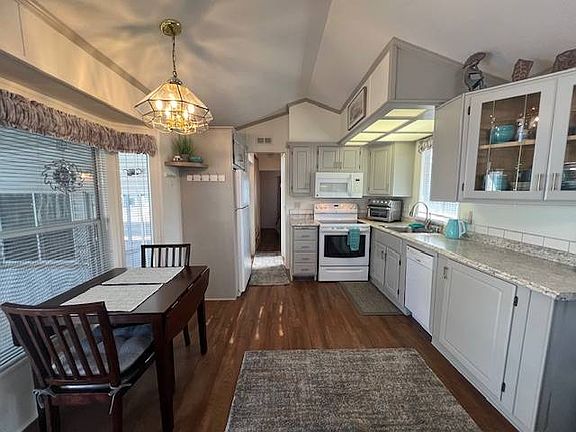 Located in a 55+ Community known for it's Active Lifestyle and Amenities, this park model is Fully Furnished & Move-in Ready! Located near the community center! The exterior is nicely painted with a carport with a privacy screen, two sliding glass doors, awnings, and window screens. Inside, the home is nicely furnished with updated countertops, white appliances, a stainless steel single-bowl sink with a soap pump, dishwasher, flat-top stove, vaulted ceilings, and fresh interior paint with crown molding. The bathroom offers an upgraded vanity, water-saving toilet, and a beautifully tiled step-in shower. The bedroom includes a queen size bed, mirrored closet doors, built-in drawers, counter space and ceiling fan. The Arizona room has newer vertical blinds, carpet, a corner reclining sofa, and a flatscreen TV. A laundry room with a stacked washer and dryer, extra storage, outdoor living space, and storage under the stairs complete this well-maintained home. Lot rent is paid until September 2026. Some items pictured may not convey. Lot rent is noted as a monthly estimate and is due annually. Call today to view this home!